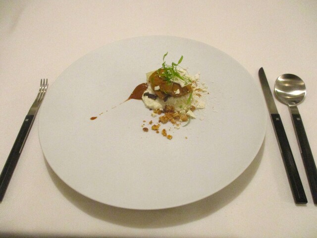松阪牛:良いサシの入った松阪牛 もも肉のローストに、これでもかというほど沢山の秋トリュフが削ってあり、マイクロクレソンを散らしてあります。 松阪牛の美味しさもさることながら、トリュフの香りが堪りません! 下には黒トリュフの入ったジャガイモのピュレ、付け合わせに小さな蕪、素揚げした万願寺とシェリービネガーで煮込んだ牛蒡が敷かれています。 間違いのない美味しさですネ!