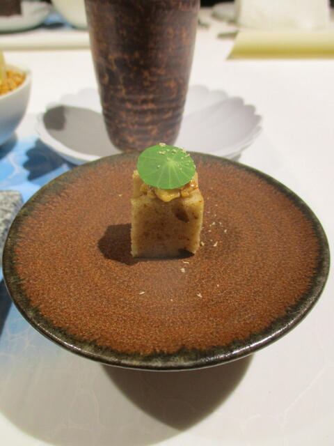 ◎ お楽しみ:とても可愛い小さな突き出し4種。ポエムを感じますョ! ① フォアグラのテリーヌ、ハチミツ、パンデミスパウンドケーキ、上部にクルミとピンクのコスモスの花びらが添えられています。 ② キャビアと細かく刻んだ鮑、フレッシュミントのハーモニーが素晴らしい。中には サワークリームがタップリ入っています。 ③ パプリカのムースの上に、鱒子とオリーブオイルのパール、スペイン産のやや小粒のグリーンピースが添えられ、赤いペンタスが飾られています。 ④ フードドライヤーで乾燥した野菜のスライスチップ:バターナッツ南瓜、赤玉葱、蓮根、ビーツ、人参があずき豆のなかに刺してあります。