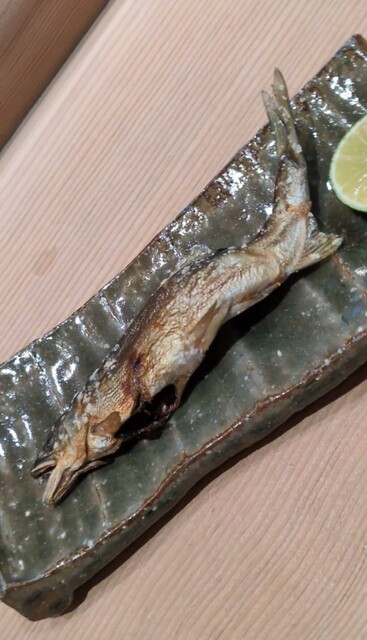 ◎ 焼き物:和良川の友釣り天然鮎:1時間以上かけてじっくりと焼き上げてあります。蓼酢と酢橘でいただきます。岐阜・郡上市「和良川」の清流で育まれたブランド鮎。