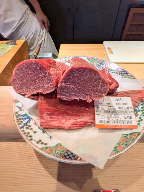 肉料理:遠州夢咲牛のシャトーブリアンを炭火焦がし焼きして、山葵、胡桃とバルサミコの漬けダレでいただきます。流石!シャトーブリアン! とても軟らかで美味しいですネ!♡♡