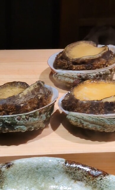 ◎ 蒸し物:越前の鮑 酒蒸し。昆布で包み、肝ソースとクリームチーズを添えてあります。
