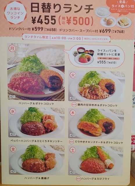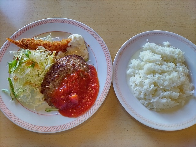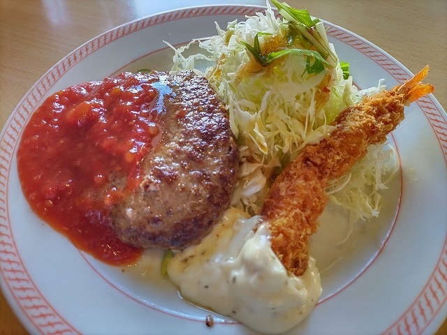 本日の日替わりランチは、ハンバーグとエビフライにライス(パンも選べます)。