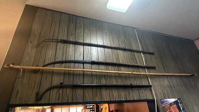壁には、天然うなぎの漁に使用していたうなぎ鎌やうなぎ筒などが飾られています。