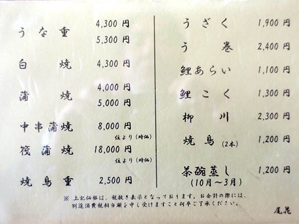 しばらくご無沙汰だったので2004年の鰻納めは「尾花」にすることにした。夏に行った方から尾花の暖簾の天然うなぎの天然の文字が消えていたと聞いたが今日は紺地に白抜きの暖簾にはしっかりと天然うなぎと染め抜かれていた。