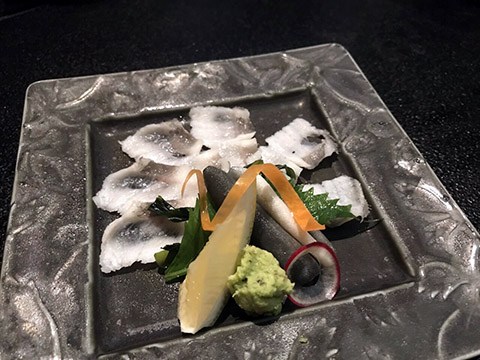 うなぎのお刺身はありそうでない料理なのです。それはうなぎの血には「イクシオトキシン」という毒素が含まれているので、生で食べる場合には、これを完全に取り除かなければならないので、うなぎ屋さんの常識ではうなぎの刺身を「外道」として扱わないのです。しかし、川昌では試行錯誤の末、血の毒素を消すことに成功し、20年を経た今では看板メニューだそうです。 見た目は鯛の薄造りのように綺麗で、食感、味はふぐ刺しに似ていて美味です。皮はいかにもコラーゲンがたっぷりという感じで味はもちろん、美肌効果で女性にお奨めです。