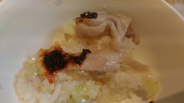 まずはサービスの「蒸し鶏ねぎ油掛けご飯」登場。蒸し鶏はかなり苦手なんだな… どれどれ