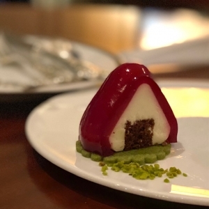 スヌーピーのドッグハウス(フランボワーズゼリーをまとったチーズケーキ)。
