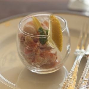 ツナとアルファベットのパスタとレモンクリームとビーツを和えたものに海老とレモンが添えられている。