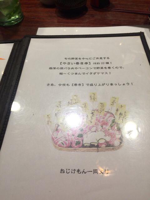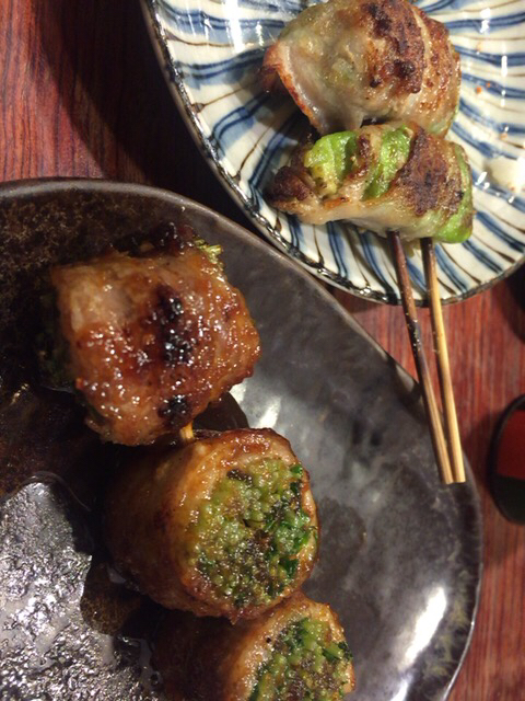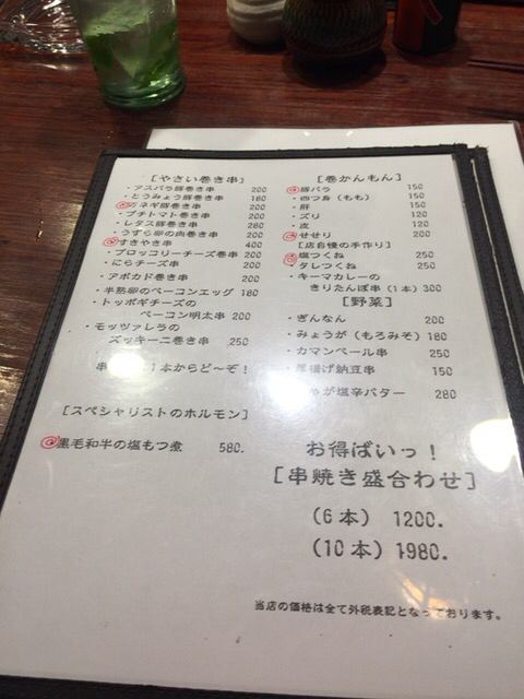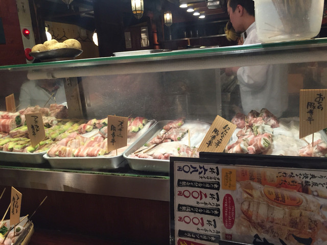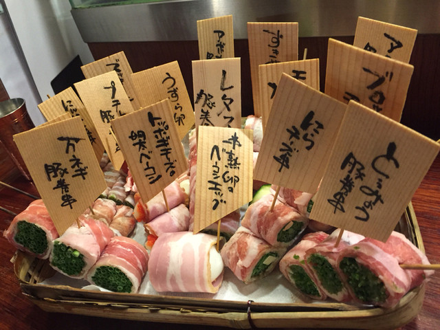 所狭しとカウンターショーケースに串が並んでます。様々な野菜の豚肉巻きの串が沢山。美味しそう。