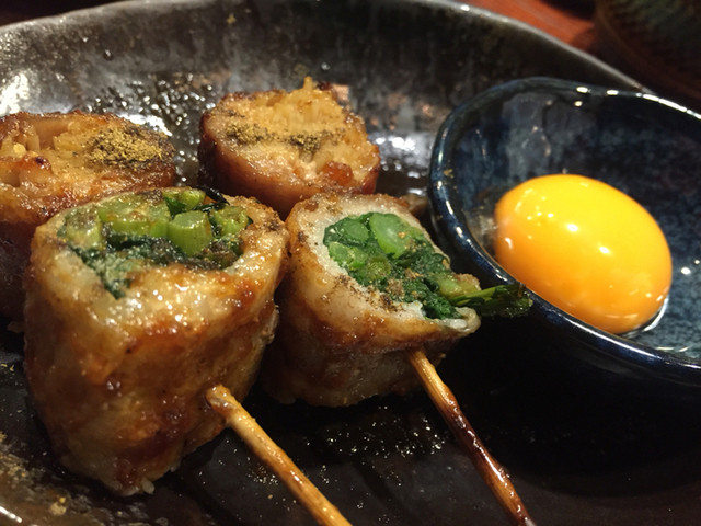 スキヤキ串も、えのきと春菊がお肉で巻かれて、タレにつけてでてきて、卵黄につけていただきます。400円と串の中では一番高いですが、めちゃ美味しい、楽しい感じです。