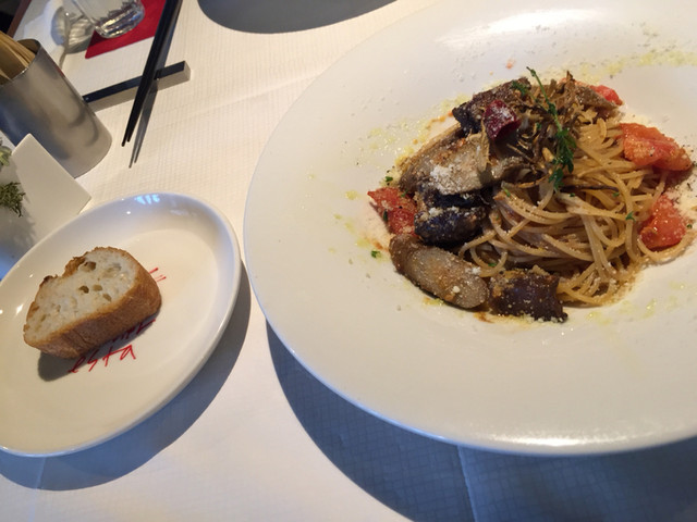 メインは、イノシシのお肉とゴボウのトマトソースのパスタ、