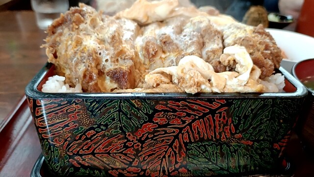 カツとじがお重のご飯を覆い尽くすインパクトだけでなく、箸を入れると、外見からはわからなかった厚さ(約2cm)のカツがお出ましです。肉は柔らかいのもいいのかもしれないけど、中までしっかり火の通った肉をかっ喰らい、胃に喝を与えます。