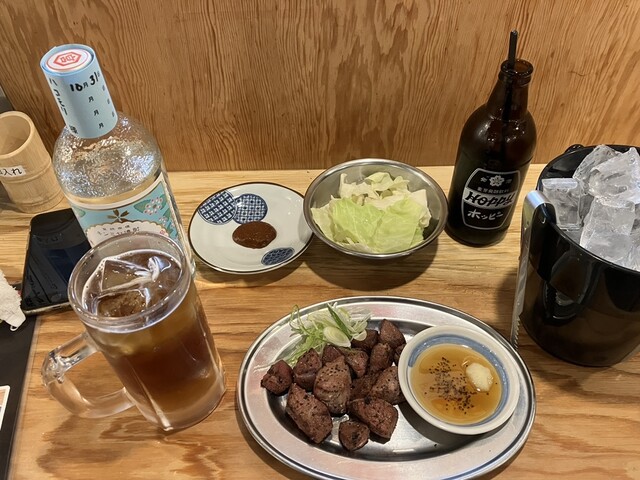 まずはおかわり自由のキャベツと、金宮焼酎のボトル+黒ホッピーで乾杯。これだけでもう気分は上々。