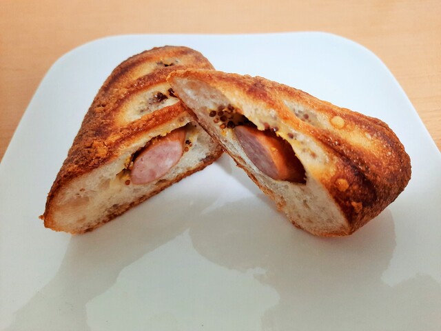 表面はパリッと薄くチーズが香ばしい!ジューシーなソーセージと粒マスタード、風味豊かな生地の一体感抜群