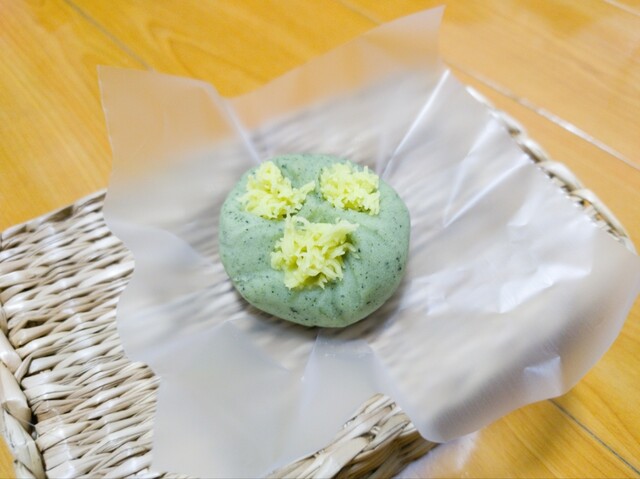 なたね…よもぎの練り切り、粒あんは力強い甘さ
