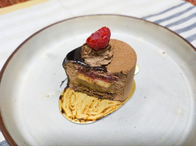 滑らかなチョコムースの中にフランボワーズの酸味が甘さを和らげてくれます