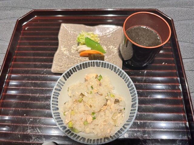お食事 山菜と桜鱒の土鍋ご飯、赤出汁 香の物