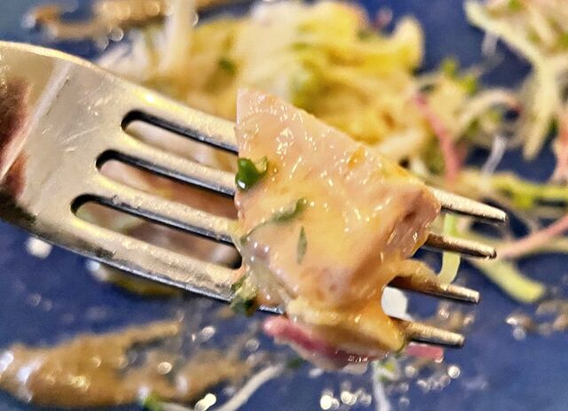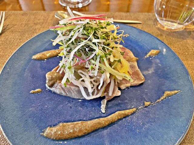 ヨコワまぐろは黒オリーブと梅のソースでいただくと美味しい(^^♪