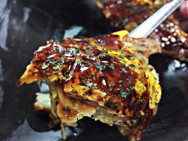 豚肉、スジ、イカ、エビ、ホタテなどトッピングが全て入ったお好み焼♪
