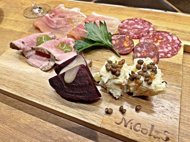 生ハム、サラミ、ポテサラ、ビーツなどワインに合う前菜の盛り合わせです♪