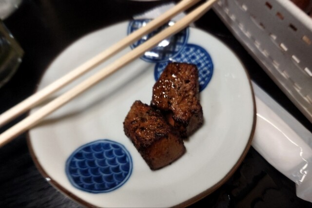 こちらでも店長が私のオーダーを覚えてくれていてドリンクパスポート白ホッピーセットとうちたけさんボトルが勝手に出てくるが、この日は今年から週2日設けると決めた休肝日とバッティングしたので店長にドリンクは烏龍茶と店長に告げます。鶏炙りは必ず食べるのでグラム数だけ聞いてくるので400と答えます。