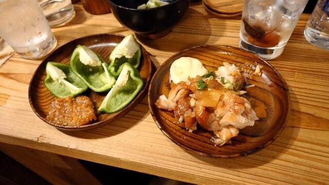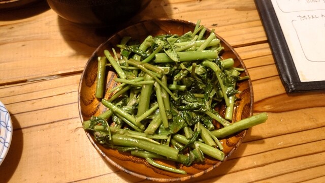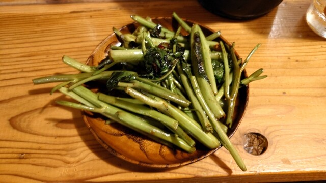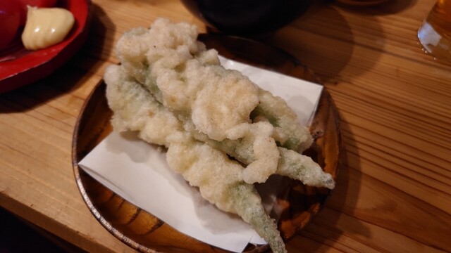 日替わりメニューに珍しく明日葉天が2つ書いてあったのでそれを注文し、他にも葛飾野菜フェア商品の無限ピーマン、茶豆などをやりました。