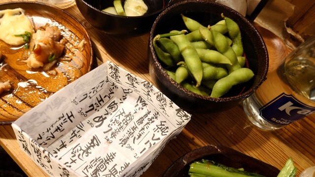 茶豆のから入れが日替わりメニュー表を折って作っていてなかなか気が利いています。リクエストして1ついただいてしまいました。家宝にします。