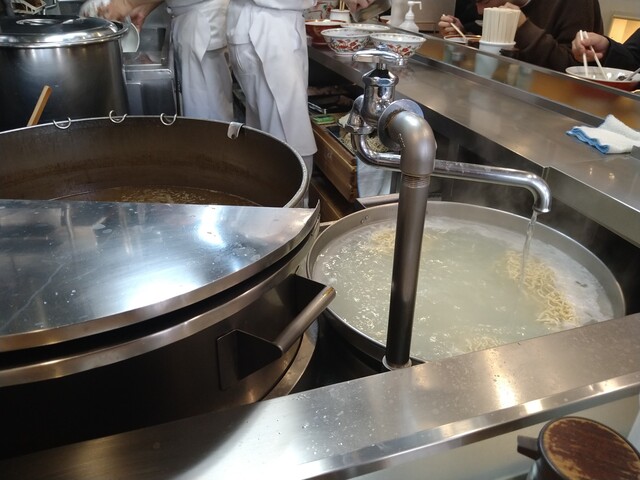 大きな鍋で麺が泳いでいます。隣はスープ寸胴です。ラードも一緒に煮込まれているので、スープを丼に入れるにも技が必要です