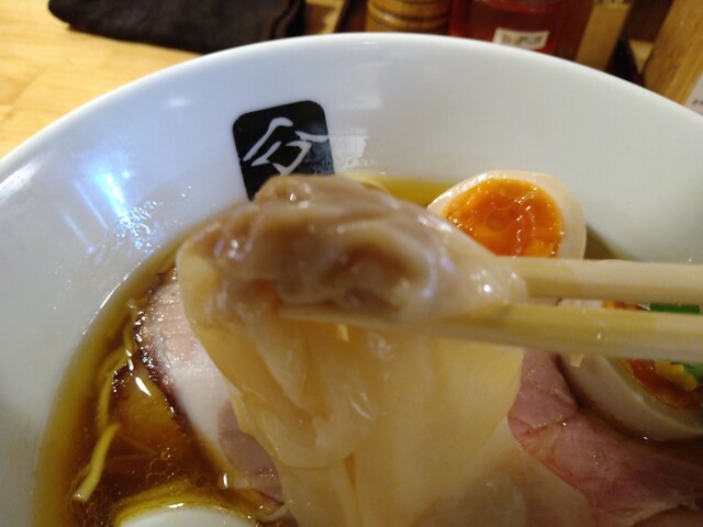 スープを一口飲んで唸ってしましました。美味いです。いわゆる流行りのカエシ強めの鶏清湯の味は想像がつくのですが、これはそこを軽く超えてきます。カエシも強くない黄金色のスープなのですが、ブワッと鶏の旨味が来るという感じではなく、じんわりかつしっかりと重層的に旨味が押し寄せてくる感じです。鶏や野菜、昆布などへの拘りもあるでしょうがこれは出汁抽出の技術レベルの高さと、鶏油の質の良さではないかと推測します。特に鶏油はそこそこ量が入ってますが、油が入っているという感じがしないくらいスープと一体化しています。
