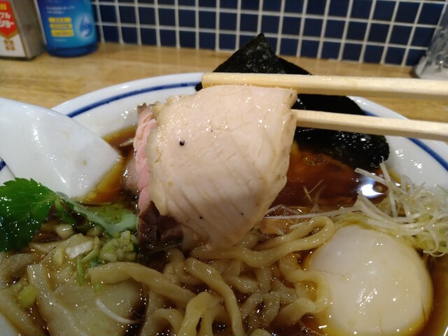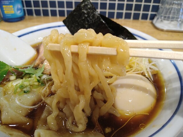 提供された中華そばのスープは見た目から美味いと確信できるもので、鶏の芳醇な出汁とくっきりとした醤油からくる印象は「今風」なものですが、じんわりと節系の旨味が重なってくるあたりは伝統的とも言えます。魚介のベースとしては煮干しよりも節系がメインで、個人的にはもう少し煮干しが立っても良いのかなとも思いましたが、バランスの良さは半端ではなく、かかっている手間の複雑さを感じられるものです。
