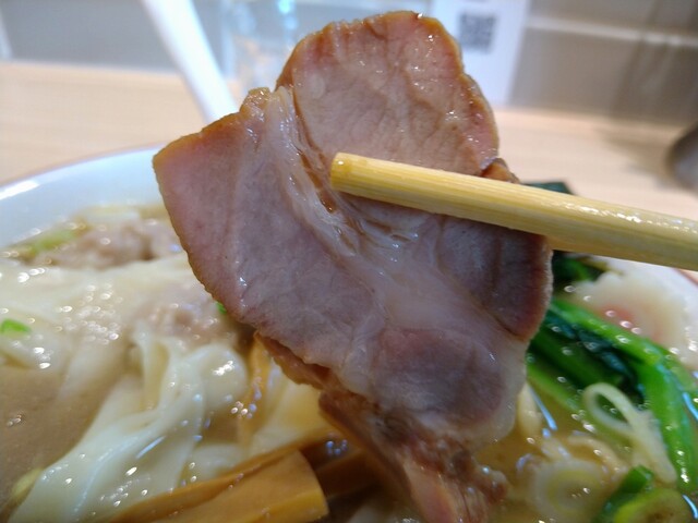「ワンタンメン」には小ぶりなものが3枚入っていましたが、吊るし焼き系の香ばしいチャーシューでそこそこ噛み応えはありますが美味いです。チャーシューメンにしたときは部位が変わるかも知れませんが。