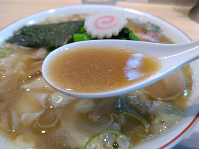 メンマは散らかっていますがしっかり味の染みたコリコリ食感が美味いやつで、小松菜と思われる青菜も良いアクセントになっています。荒く輪切りにされたネギもこのスープには絶対必要かつマッチするものでした。