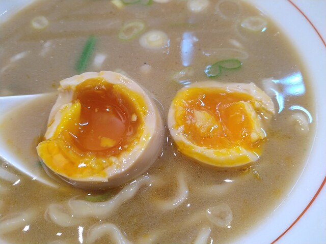味玉は事前に湯煎されていて温かく、黄身はトロトロで味染みも十分で今時120円では申し訳ないレベルの美味さでした。