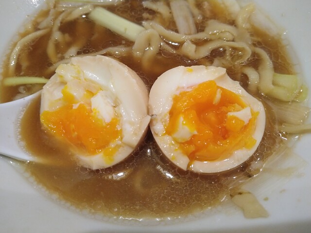 チャーシューはどっさり入っていますし、何と味玉はダブルで入っています。何とも自由な店主さんで、お客に対して「期待以上」を提供するというスタンスのなのでしょうか、常連さんへのサービスなら分かりますが、今まで経験したことのない衝撃を受けました。