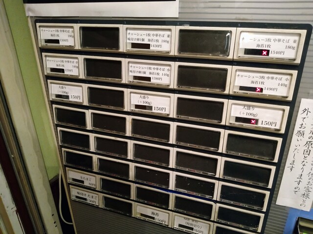 激狭の店内で券売機のメニュー「チャーシュー1枚 中華そば 並 味付け卵1個 海苔1枚 180g」1430円というのをポチって狭小のカウンター席で待ちます。
