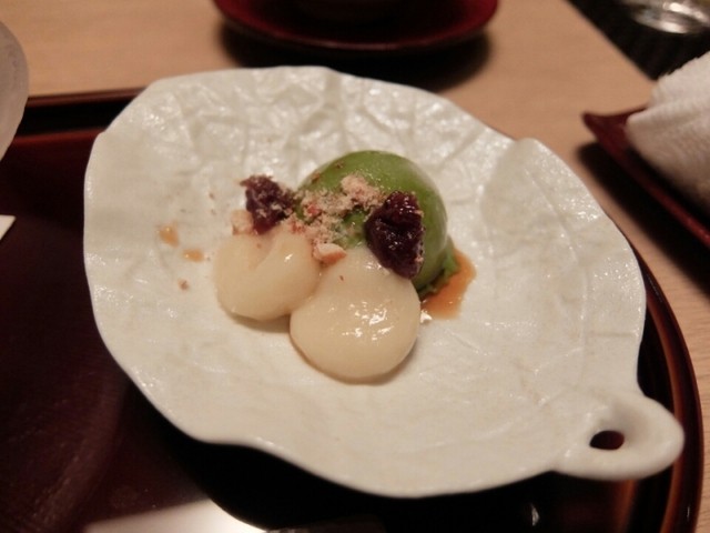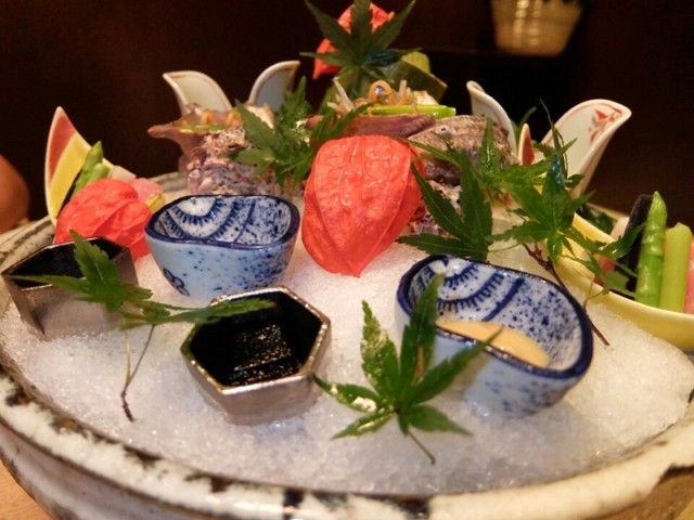 本鮪、鱸、鱧の落とし寄せ醤油、白ポン酢、天城山葵