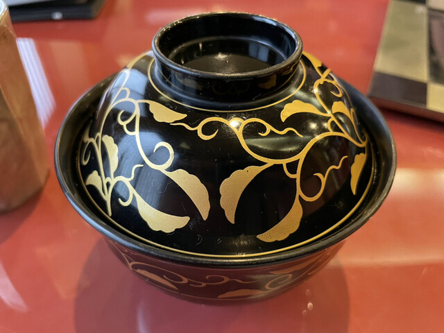 店内は畳の上に漆塗りのテーブルと椅子がセットされており一番奥に案内されました。先に入った5、6名の方々はこちらには見当たりませんでしたが、奥に個室があるようでそちらに入っていたようでした。席に座るとちょうど横を向いたところにカウンターとつけ場があります。畳の上のテーブル席の椅子に座っていますが、カウンターは畳の高さに座り掘りごたつ式に足を下す形、つけ場も低く作られているのでそのカウンターに座った方に合わせた高さになっています。劇場型和座敷といったところでしょうか。高低差はありますが広々としていてカウンターまでの距離もあるので違和感は全くありません。つけ場の背の壁も大きな漆塗りになっていて「奴」の崩し文字が入っていて全体に実に贅沢な感じの店内になっています。