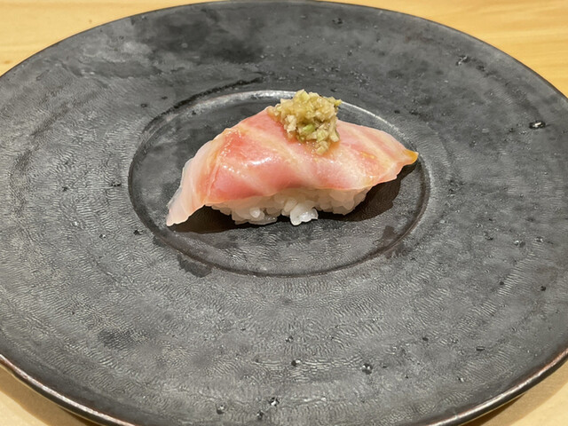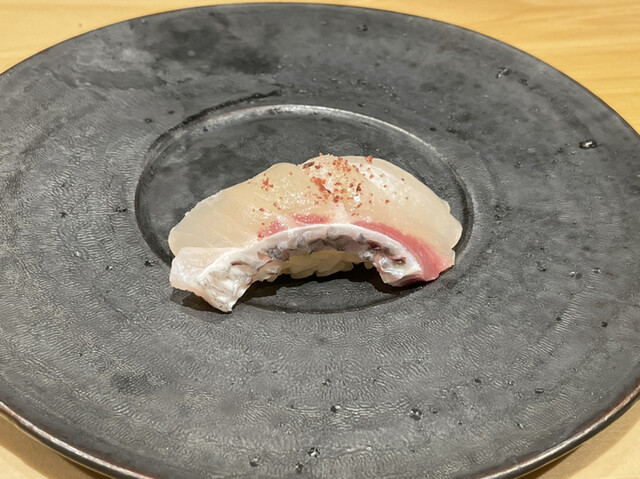 ノンアルビールで喉を潤していると握り最初の3貫、烏賊(雲丹塩)、むらさきうに、石鯛(岩塩)がやってきました。これまた塗りのきれいな器に美しく並んでいます。まずは烏賊は結構な噛み応えでゴリっとしていますが噛めば噛むほど旨味が出てきて美味しいです。昨夜とはまた違ったタイプの握りワールドの始まりです。そしてむらさきうにの握りは、解禁まもなくですし時期も短いのでなかなか食べられない逸品で、言わずもがなの美味さですし皆さんの写真よりも多めに乗っている気がしました!石鯛は岩塩がガリっとしょっぱいからこその甘さと旨味が感じられます。この時点での感想は、なんだこりゃ!今までに食べたことのない寿司だぞといったところです。