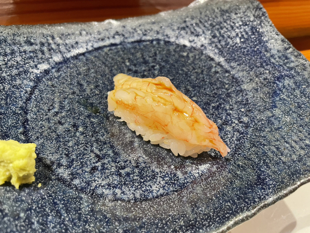 ツマミの後は当然握りに突入ですが全く勢いが衰えず、むしろ加速していきます!鮨はイカで決まるよという声とともにイカの握りが供されます。その後も順不同ですが、アラ、鯛、車海老、縞鯵、小肌、中トロなどなどどれも、醤油や薬味まで合わせてあるのでそのままいただきます。珍しいネタとして、なみくだひげ海老なる海老がとても美味しかったのですが、このような珍しいものはiPadで画像も見せてくれる徹底ぶりです。