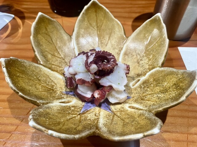 さてさてツマミが始まります。温かい出汁巻き卵とさつま揚げを皮切りに刺身、蒸し蛸、雲丹の乗った茶碗蒸し、雲丹とシャリの小鉢、アワビと進んでいきます。この間にも大将の出身地にちなむ話、お魚の産地、重量、寝かせの時間、味を引き立てる薬味のことなど詳細に説明していただけるので、その説明に感心しつつも味わっていきます。