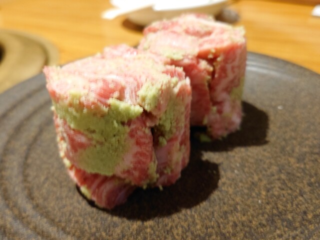 友人の快気祝いで5回目位の再訪。わさびが脂で溶けて最高に美味しく食べれる。赤身三点盛りもわさび醤油でさっぱり食べれる。ロースは卵の黄身付けてすき焼き風で食べるのたまらなかった。7500円のコース頼んだんだけど、追加注文しすぎて失敗(ノ_<。)。頼む人数分間違えた。店員さんにちゃんと1人前がどれくらいか聞いて頼まないとダメだった。すごい量が来て絶望した笑。写真二枚目(2人前って言ったけど3人前くらいの気配するw)3枚目(3人前)美味しく味わえる量超えてしまって後悔。次は追加は1人前ずつにします