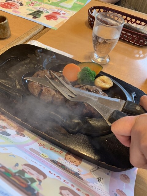 2つにカットされたハンバーグは、長いナイフとフォークで鉄板に押し付けられ、ジュージューと音を立てながら仕上げの焼きに入ります。そして、最後にオニオンソースをかけられ、ソースの飛び散りが収まったら、いよいよ食べる準備が整います。