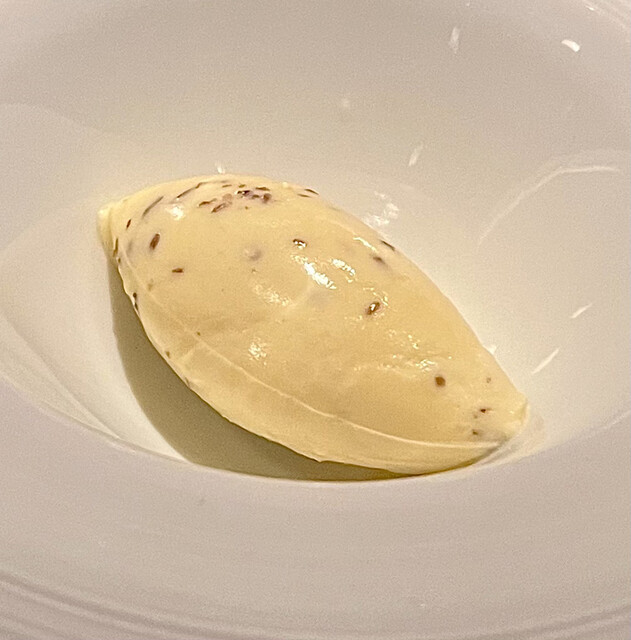 ⑥白トリュフと自家製バター〜パンにアルバ産白トリュフと自家製の出来たてで軽く口当たりの良いバターで。
