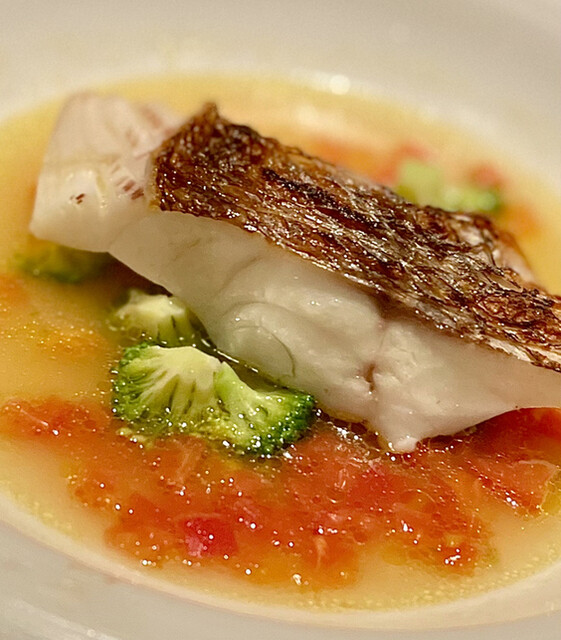 〜藤本さんの神経締めされた真鯛。骨の出汁に軽く煮込んでから炭火焼きして、余すところなくすべて使い切る。かと言って旨味が出汁に出てしまった訳ではなく、逆に出汁の旨味を真鯛に還流させて更に旨味が増幅したアクアパッツァとなっている。飛騨高山東農園のブロッコリーを添えて。