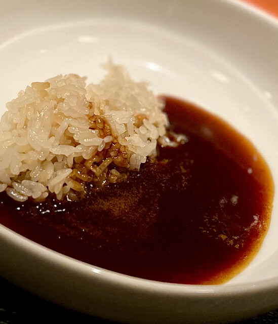 〜但馬玄の筋や骨出汁にスネ肉を加えたデミグラスソース、モモ肉のコンソメで炊いたご飯とバッチリ。もの凄い香りと濃く、カレー屋さんでは頂けません。