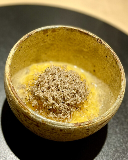 〜完熟卵のパスタは香りが凄いタヤリン。ご主人の地元である美唄な北海地鶏でとったブロード(出汁)。それに70℃で18時間、バターを合わせたもの。イタリアのトリュフハンターから仕入れたオータムトリフまで。濃厚でネットリと舌に纏わりつく美味しさ。