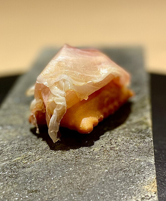 〜ドルチェワインと昆布出しでマリネした北寄貝をバジル茶で火を入れ、発酵させたマスカットと鹿児島の青レモンのジュレで合わせた逸品。爽やかなジュレとマスカットに軽めの味わいを含ませた北寄貝とは、何とも上品な仕上がりに唸ってしまう。