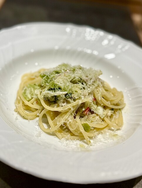 ~オホーツクの毛蟹とチーマディラーパのアーリオエフッロ。野菜は地元でしか流通しない特殊な野菜のチーマディラーパと蕪の葉っぱ。めちゃめちゃ良い香りが漂う。