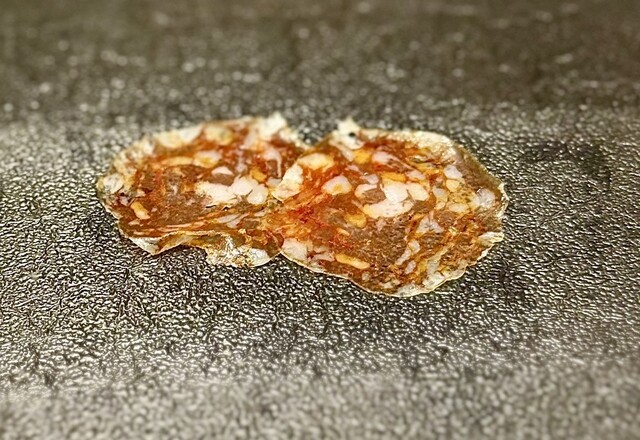 〜白ワインと黒胡椒を練り込んで発酵させたサラミは、極薄くスライスされているがスパイスが効いてパンチある味わい。シャンパンと良く合うね。