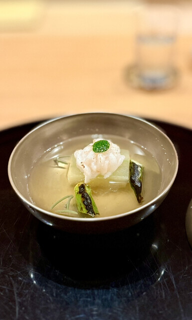 老舗らしく代々続く銀色の器の椀物は、澄んだ出汁に冬瓜に白海老、オクラと優しい味わい